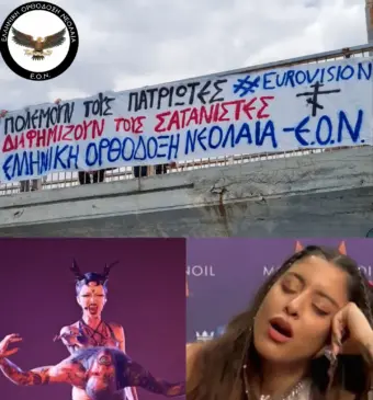 Παρέμβαση Φοιτητών ΕΚΠΑ της Ε.Ο.Ν. με ανάρτηση ΠΑΝΟ στα Νότια Προάστια των Αθηνών κατά της συμμετοχής της χώρας μας στο καρναβάλι σατανισμού και πορνείας της Eurovision στην οποία μία αναιδής ελαφρών ηθών εταίρα δυσφημεί, ευτελίζει και καταισχύνει μετά θράσους την Ελλάδα με μία βδελυρά αντιαισθητική κουστωδία παρενδυτικών, ένα φαιδρό ασμάτιον ελληνοβαρβαρικής κραυγής, ένα τσίρκο πολιτισμικής χαβούζας, εκπροσωπώντας το Έθνος των προγόνων μας επί της αυτής σκηνής που εβεβηλώθη ο Σταυρός της Θείας Δόξης του Αναστάντος Χριστού από έναν δυσώδη εσμό δαιμονολατρών, οι οποίοι επεκαλούντο δημοσίως με ύμνους, τελετουργικά και ξόρκια τον εκπεπτωκότα εωσφόρο.